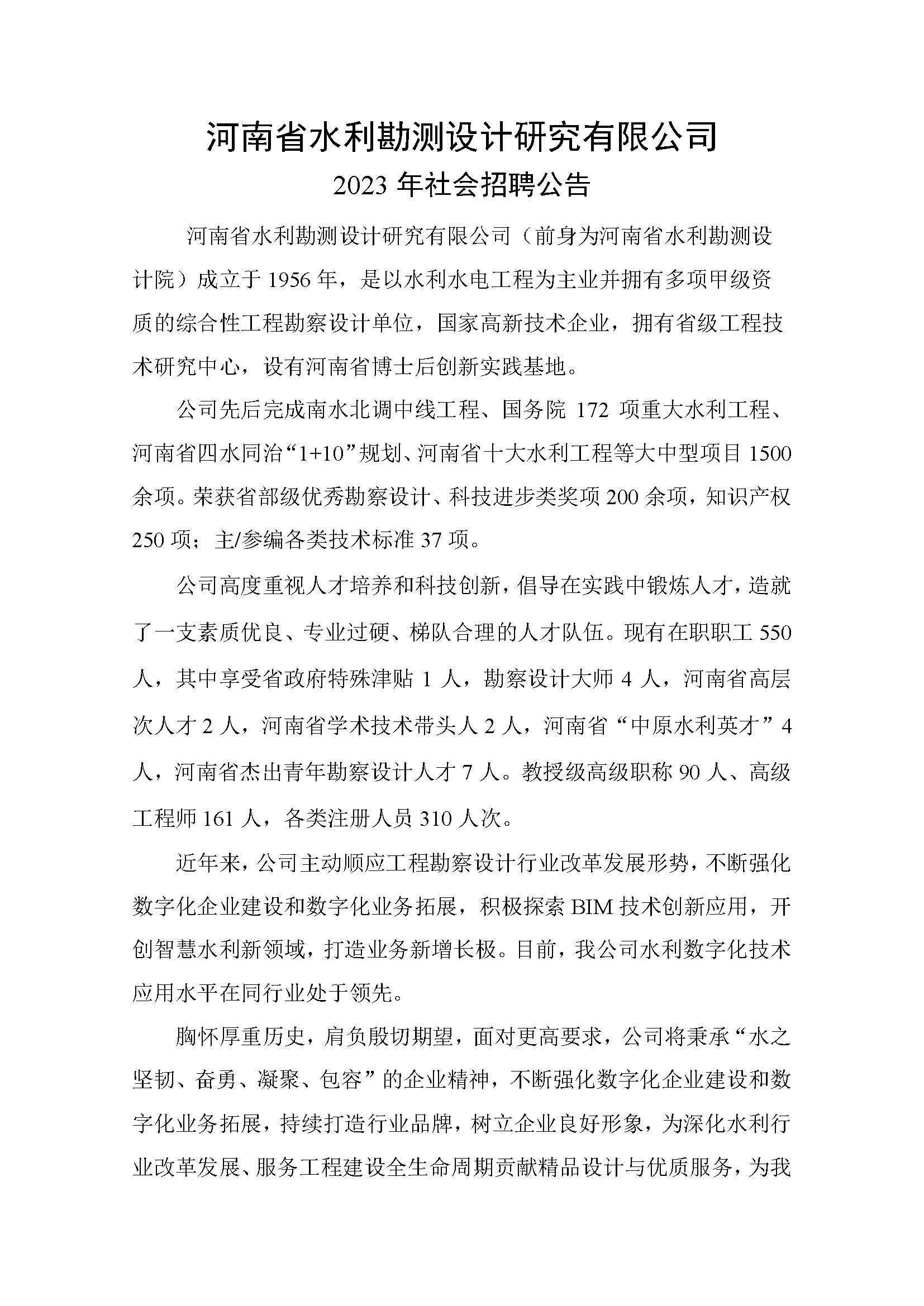河南省水利勘測設計研究有限公司2023年社會招聘公告