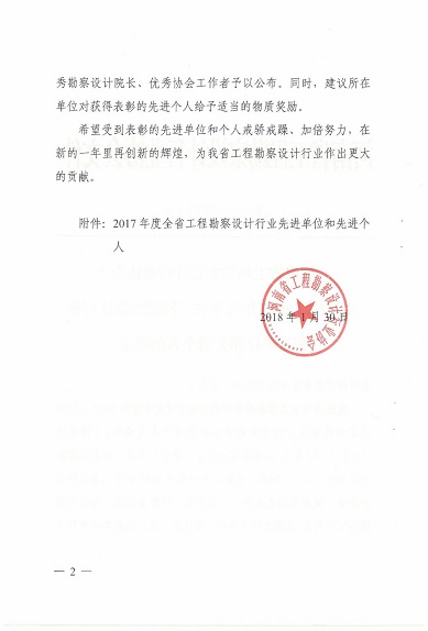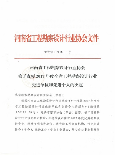 1月30日,河南省工程勘察設計行業協會發布“豫設協[2018]3號”文件,對2017年度全省工程勘察設計行業先進單位和先進個人進行了表彰。設計公司榮獲“河南省2017年度優秀勘察設計企業”、“河南省2017年度工程勘察設計行業精神文明先進單位”、“河南省2017年度工程勘察設計行業熱心公益事業獎”等3項殊榮,公司董事長翟淵軍獲得“優秀勘察設計院長”榮譽稱號,數字工程院白勇獲得“優秀協會(學會)工作者”榮譽稱號。表彰文件如下: