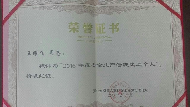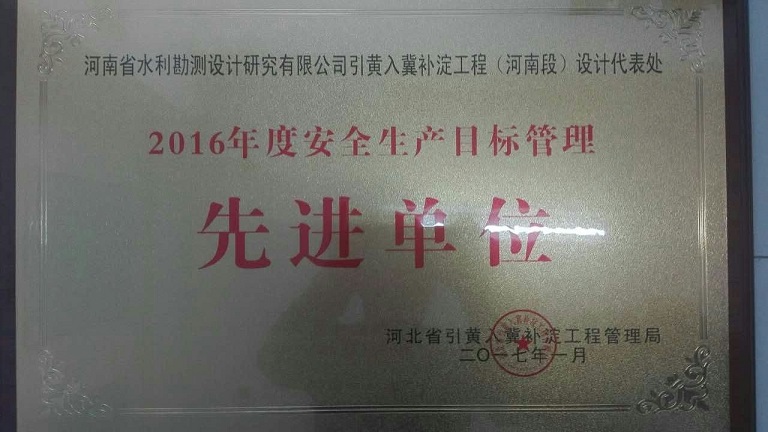 2017年3月1日上午,河北省引黃入冀補淀工程管理局對2016年度安全生產目標管理的先進單位和個人予以表彰,河南省水利勘測設計研究有限公司引黃入冀補淀工程(河南段)設計代表處被評為先進單位,設代處成員王耀飛被評為先進個人,設計二院副院長馮濤,設代處處長王偉,設代處成員張征浩、梁榮慧參會。