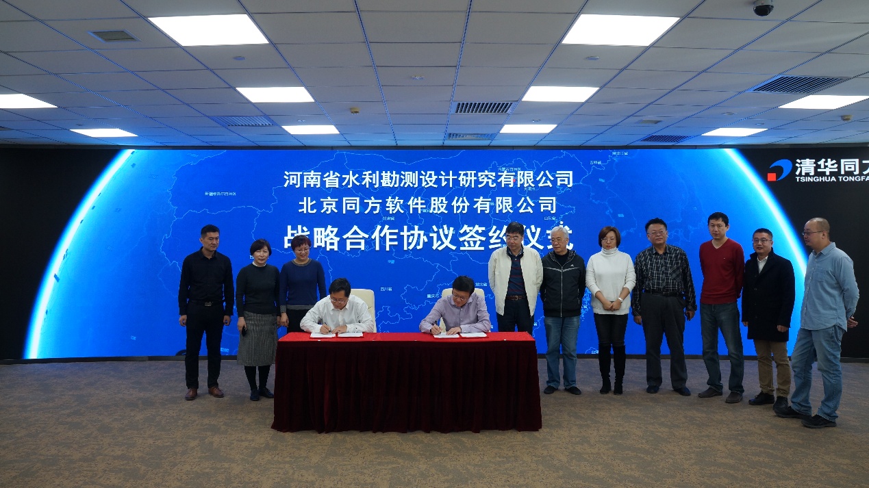 2019年3月18日,河南省水利勘測設計研究有限公司與北京同方軟件股份有限公司在北京舉行戰略合作協議簽約儀式。同方股份有限公司副總裁周俠、大數據產業部副總經理李小華、北京同方軟件股份有限公司副總經理侯小龍、大數據技術中心總經理郝斌、大數據技術中心副總經理石大為、水務事業部總經理葛彥超,河南省水利勘測設計研究有限公司董事長翟淵軍、副總經理賈少燕、數字工程院院長高英、數字工程院總工張玉明等出席簽約儀式。
