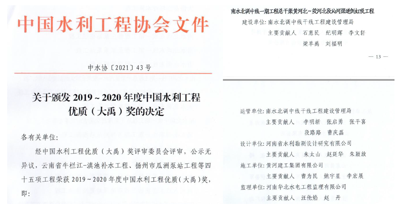 近日,中國水利工程優質(大禹)獎評選結果揭曉,由豫水設計公司擔綱設計的南水北調中線一期工程總干渠黃河北~羑河北段沁河渠道倒虹吸工程,憑借科學設計和精良施工,榮獲2019年~2020年度中國水利工程優質(大禹)獎。