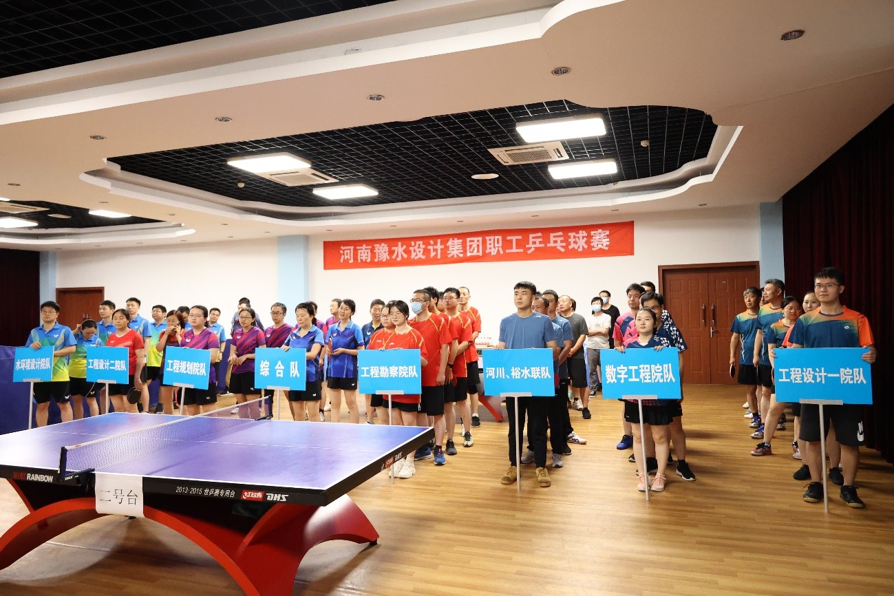 2022年7月22日(周五)晚18:30,豫水設計集團2022年夏季乒乓球團體賽在公司辦公樓一樓活動中心開幕,公司總經理朱太山出席開幕式并致辭。報名參加比賽的共有8支隊伍計80多名運動員。