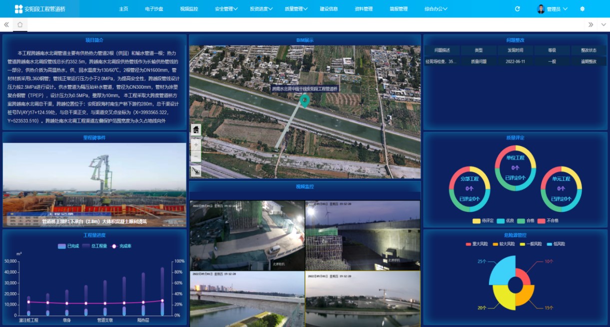 豫水設計公司工程管理院負責項目管理工作,把重心放在項目策劃和實施階段,集中力量分析管道橋工程實施的難點、工程風險、疫情防控壓力等,科學合理的制定管理計劃,充分發揮南水北調中線總干渠工程主設單位的技術優勢,開發了基于BIM和大數據技術的項目信息化管理平臺,建立了工程三維虛擬模型,融合現場各維度的管理數據,為管理決策提供實時、便捷、高效的信息化技術支撐。