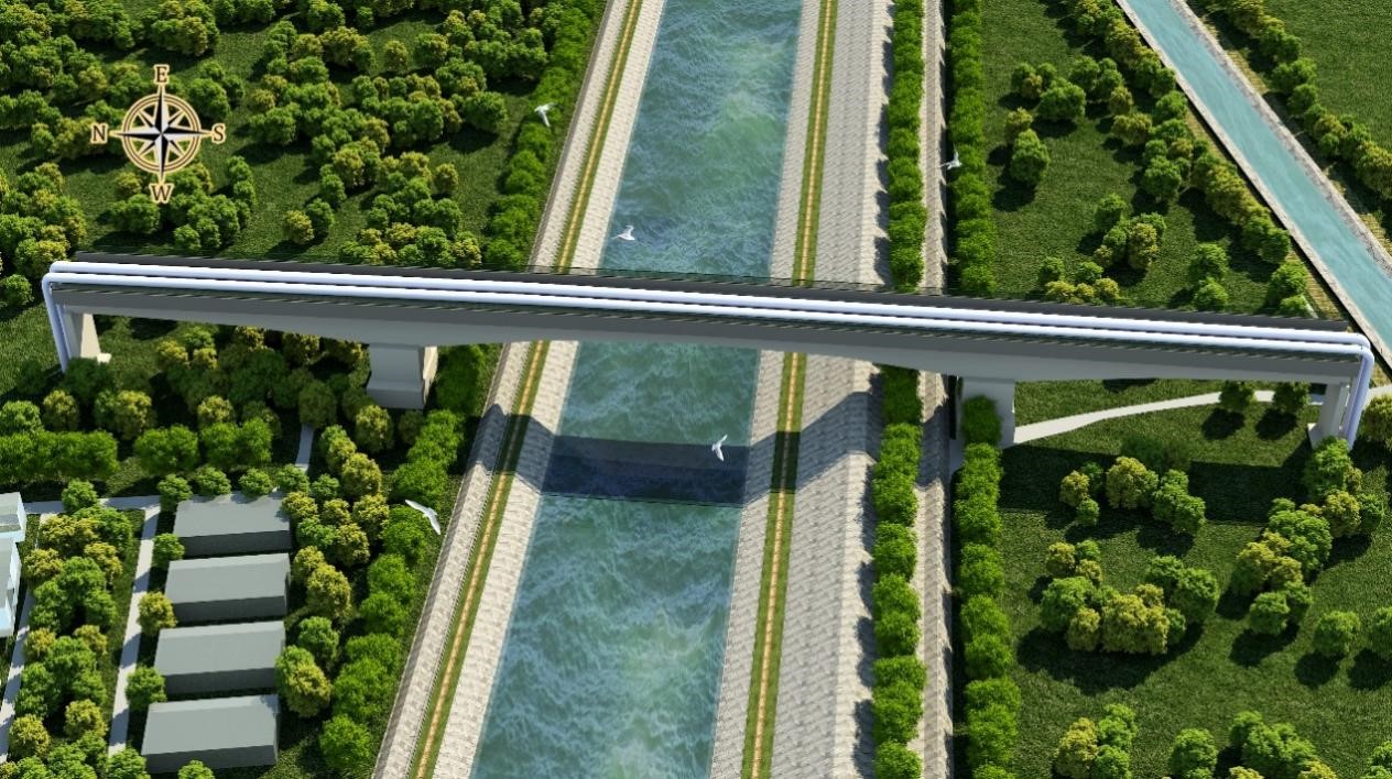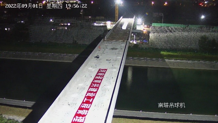 2022年8月31日下午,引熱入安長輸供熱管網工程跨越南水北調中線總干渠管道橋,在四套同步、自動連續系統牽引下,歷經90分鐘精密施工,完成高空轉體90°,實現了兩座單重8000噸、單長64米的跨渠管道橋在南水北調總干渠上空的精準對接。