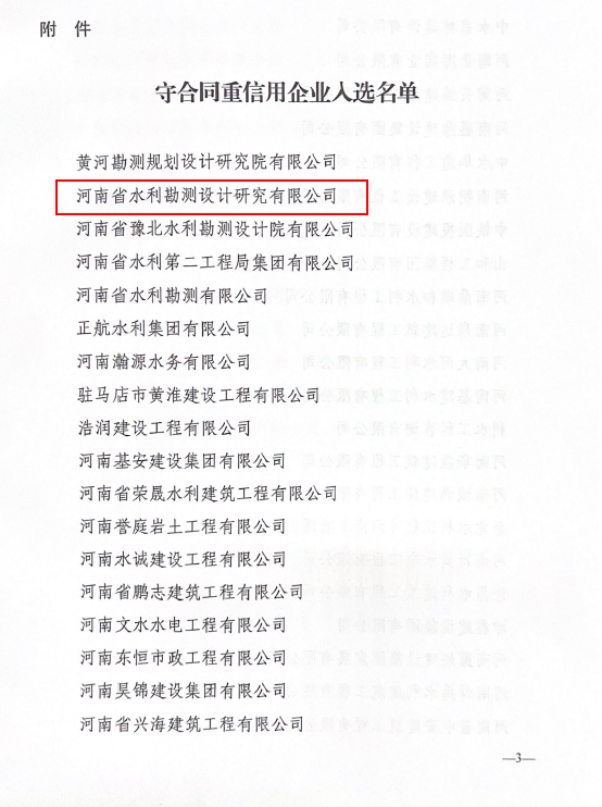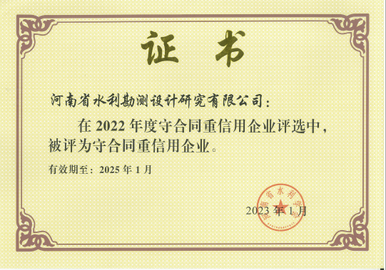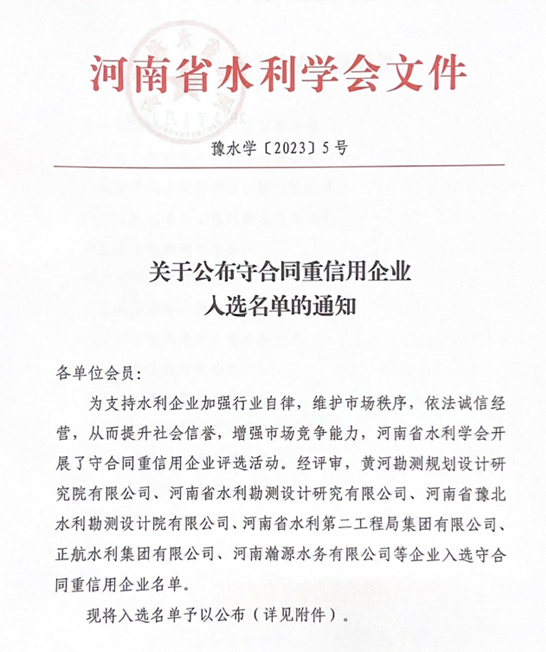 近日,河南省水利學會公布守合同重信用企業入選名單,豫水設計公司被評為“守合同重信用企業”。