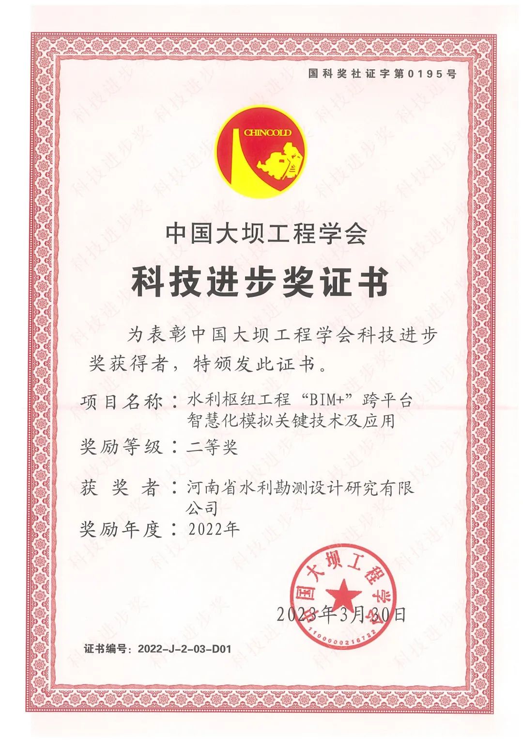 公司數字工程院深耕BIM+技術在水利行業的應用,牽頭完成的科研成果“水利樞紐工程“BIM+”跨平臺智慧化模擬關鍵技術及應用”喜獲2022年度中國大壩工程學會科技進步獎二等獎。