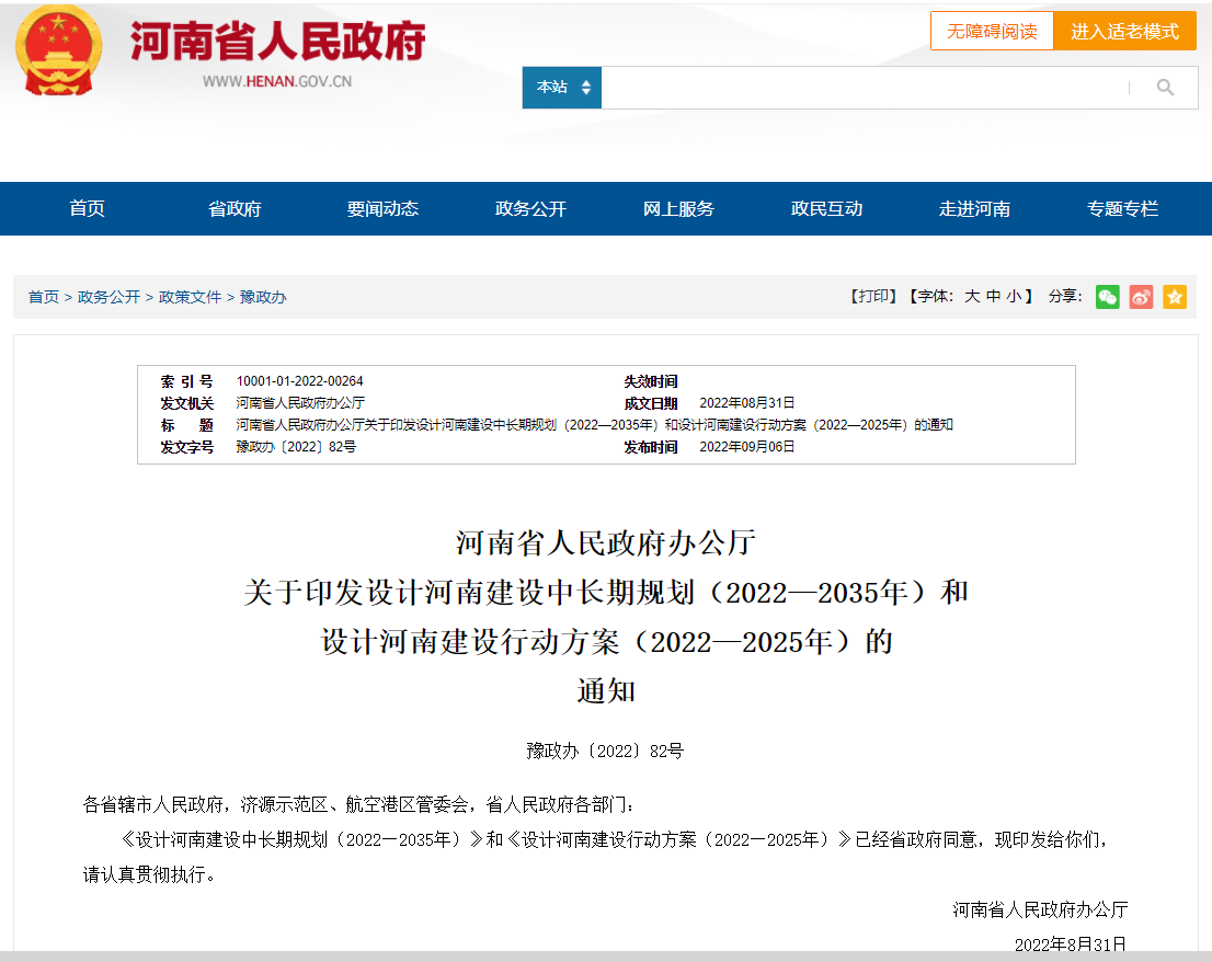 為認真落實河南省第十一次黨代會精神,加快打造設(shè)計河南,為經(jīng)濟社會高質(zhì)量發(fā)展提供重要支撐,9月7日,河南省人民政府辦公廳發(fā)布《設(shè)計河南建設(shè)中長期規(guī)劃(2022—2035年)》和《設(shè)計河南建設(shè)行動方案(2022—2025年)》。