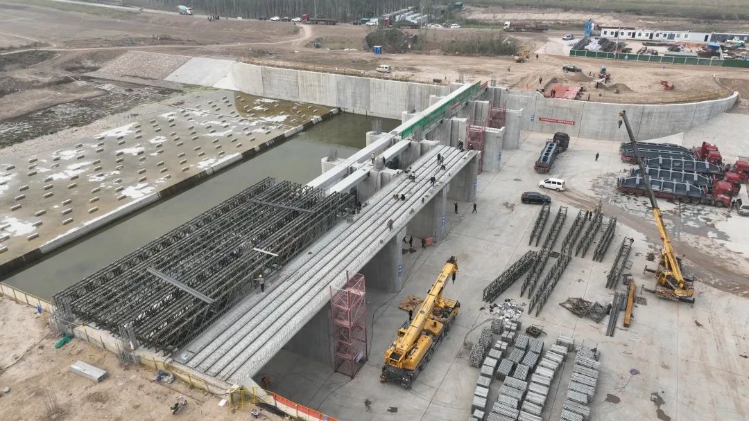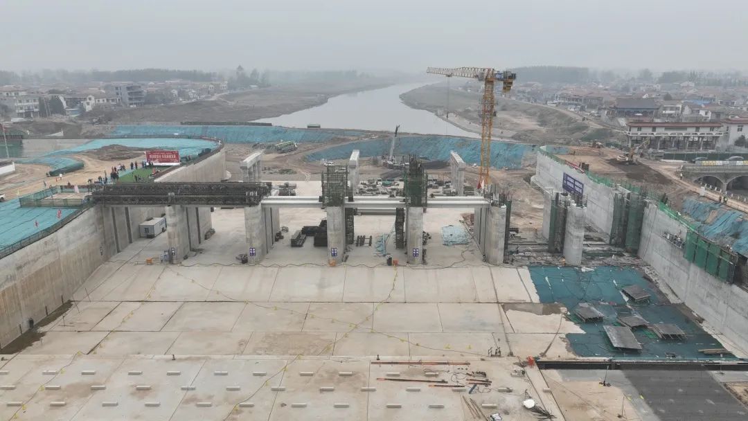 賈魯河綜合治理工程西華縣閆崗閘閘門及貝雷架安裝施工現場(盧漢 攝)